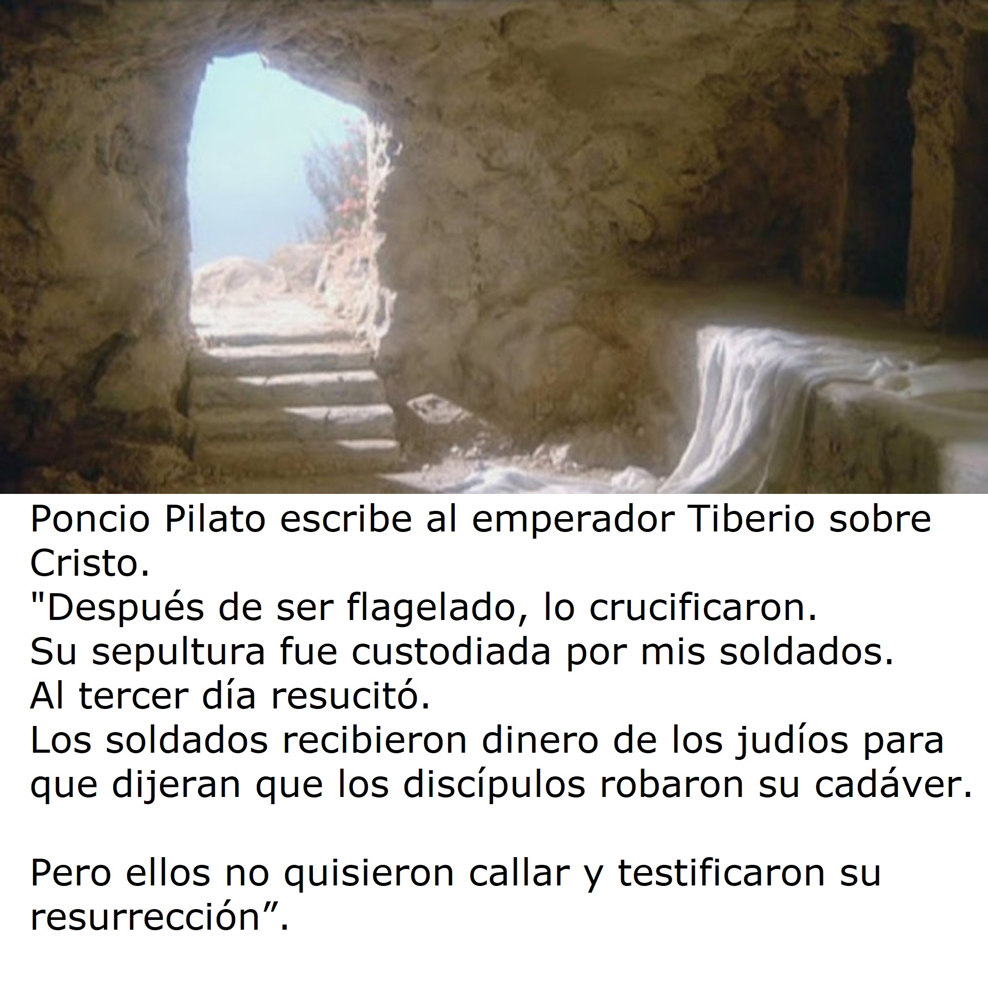 Después de ser flagelado, lo crucificaron. Su sepultura fue custodiada por mis soldados. Al tercer día resucitó. Los soldados recibieron dinero de los judíos para que dijeran que los discípulos robaron su cadáver. Pero ellos no quisieron callar y testificaron su resurrección.