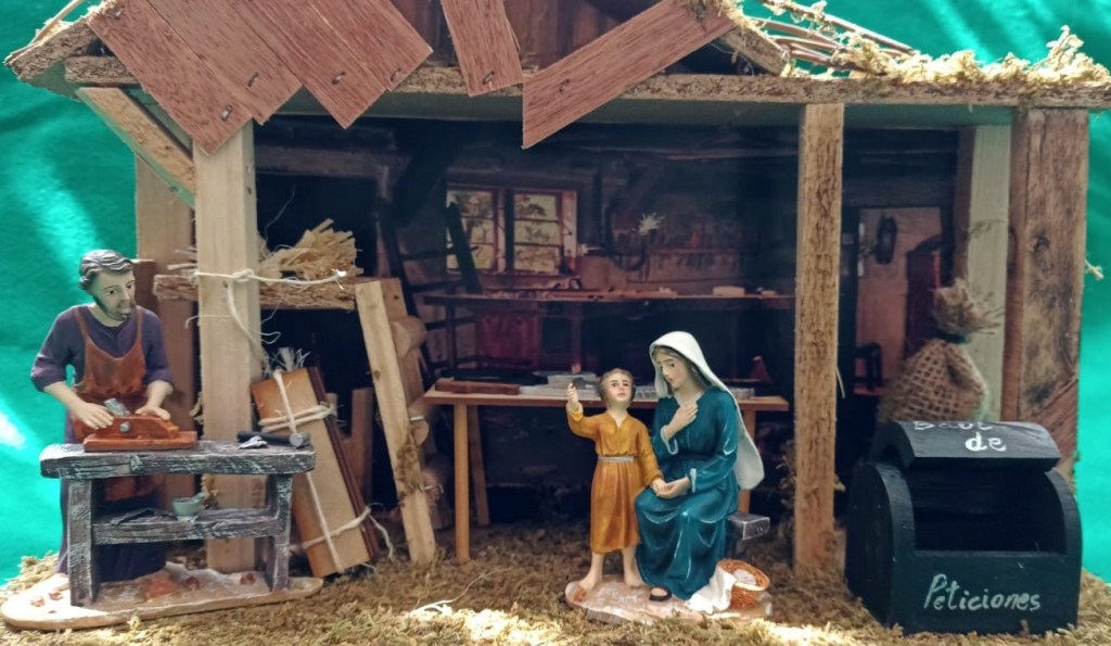 Entran en el taller. José enseña un pequeño martillo, una pequeña sierra, pequeños destornilladores, una garlopa; todo ello puesto encima de un banco de carpintero, adaptado a la estatura de Jesús.