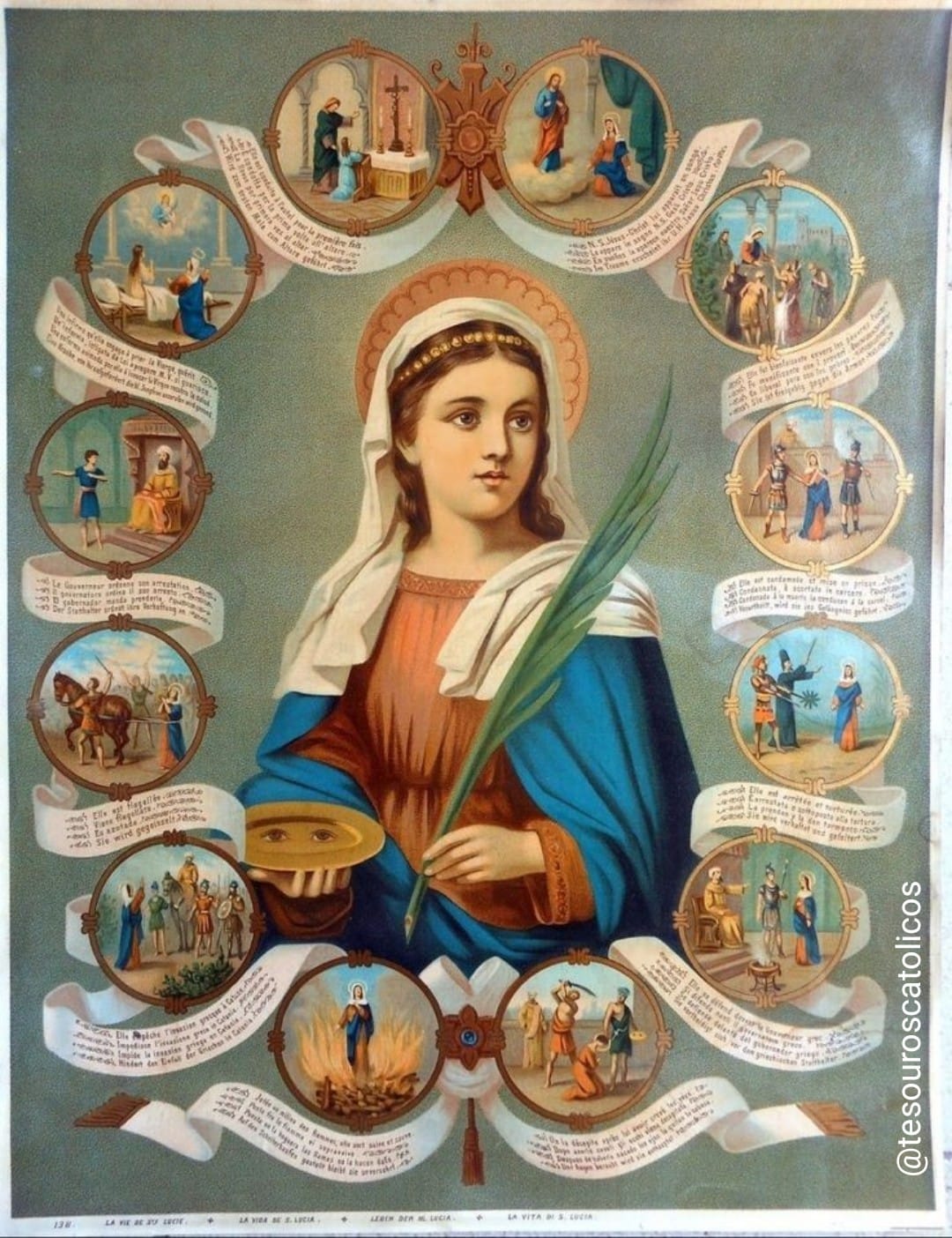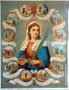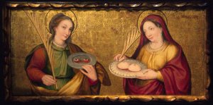 Era la belleza de los ojos de Lucía, la que no permitía descansar a su pretendiente, por lo que ella se los arrancó y se los envió en un plato. Lleno de remordimiento y sorprendido por la valentía, el pretendiente se convirtió al cristianismo.