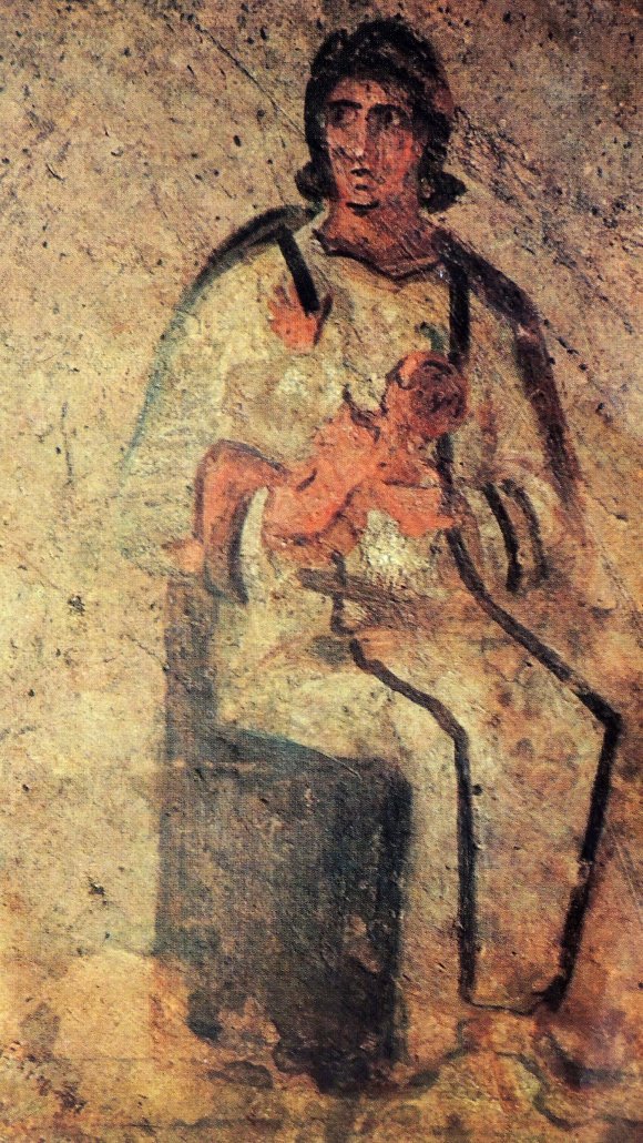 Virgen de la leche, catacumbas de Priscila, Roma, altorelieve de San Lucas Apóstol