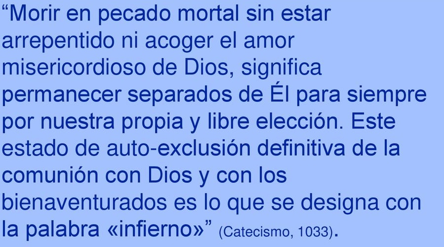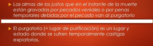 1031 La Iglesia llama Purgatorio a esta purificación final de los elegidos que es completamente distinta del castigo de los condenados, ciertos textos de la Escritura (por ejemplo 1 Co 3, 15; 1 P 1, 7) habla de un fuego purificador, entendemos que algunas faltas pueden ser perdonadas en este siglo, pero otras en el siglo futuro (San Gregorio Magno, dial. 4, 39).