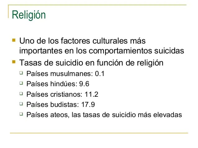 Entre los cristianos, el número más alto de suicidas se halla entre los protestantes, mientras que los católicos se suicidan mucho menos. Aunque hay que ver si son practicantes.