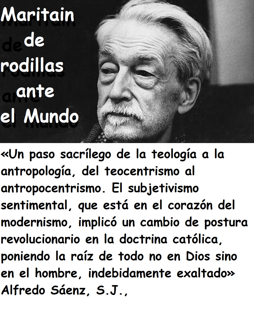 No exageramos. Esta forma de aversión se da actualmente en el humanismo cristiano, que como es sabido tiene sus orígenes en el Humanismo Integral de Jacques Maritain. Como aversión a lo sobrenatural, no tolera más que una fe subjetivista, en el fuero de lo interno, y una concepción naturalista de las instituciones sociales y políticas. Tal concepción humanista o pluralista ha paralizado y corrompido todas las fuerzas reales del apostolado católico, llevándole a la pendiente de las concesiones, de la tolerancia, de los silencios cómplices. Si en nuestro país, toda la enseñanza superior está en manos de marxistas es por obra y gracia de estos católicos pluralistas. Si en un congreso de educación, formado por católicos, no se habla para nada de la doctrina de la Iglesia y se habla indefinidamente de la persona humana, es también por este tipo de católicos.