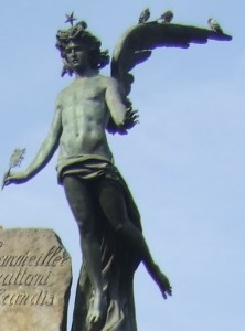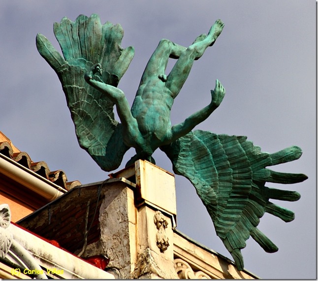 El “ángel estrellado” escultura en bronce de Miguel Ángel Ruiz ex baterista de Rock, ubicada en El Retiro, Madrid, en lo alto de la casa número 3 entre las calles Mayor y Milaneses desde el año 2005. Obra cuyo autor prefiere reducir a un simple “Accidente aéreo”, aunque admite que “las comparaciones con el Ángel Caído del Retiro son inevitables”. Hecha en Bronce con patina de cobre mide unos 2 metros con 10.