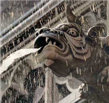 De allí proviene la costumbre de poner Gargolas como desagüe de los techos de las iglesias, palabra conectada a gargariser verbo francés, que significa «hacer gárgaras.» La palabra italiana para gárgola es Doccione o Gronda sporgente, una frase arquitectónicamente precisa que significa «que sobresale del canal.» La palabra alemana para la gárgola es Wasserspeier, que significa «escupir agua.» La palabra holandesa para gárgola es waterspuwer, que significa «escupe agua» o «vomitar agua» estos vomitadores de agua fueron usados hasta que en el año 1574, cuando se regulo el uso de bajantes y pasaron al desuso las gárgolas.