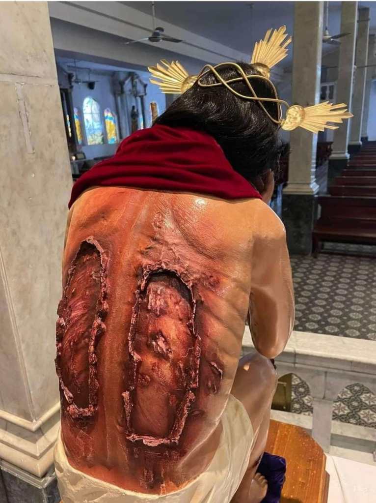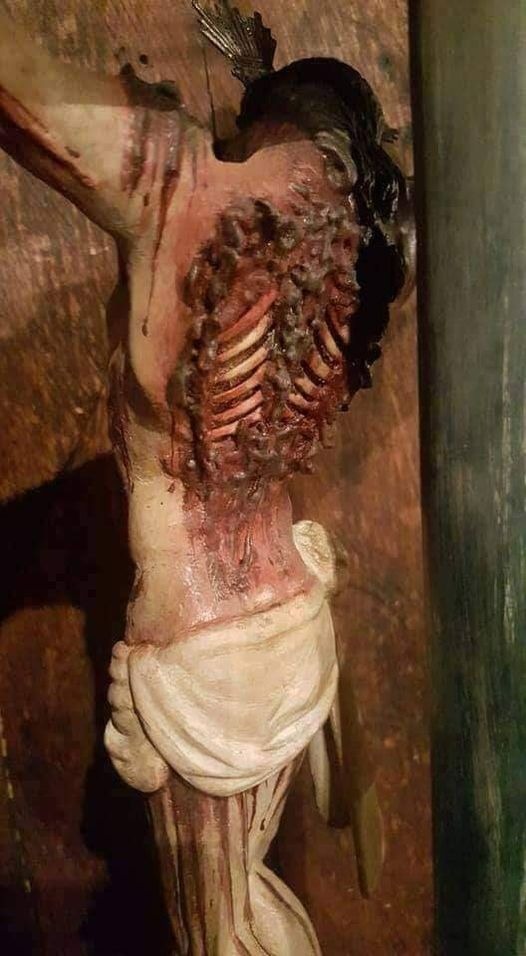 Después de ser juzgado, Jesús fue azotado violentamente con un látigo de cuero, con pequeñas bolas de hierro en las puntas y huesos puntiagudos. Las bolas de hierro causaban lesiones internas y los huesos destrozaban la carne, exponiendo la musculatura esquelética y causando gran pérdida de sangre, lo que probablemente lo dejó en un estado de prechoque.