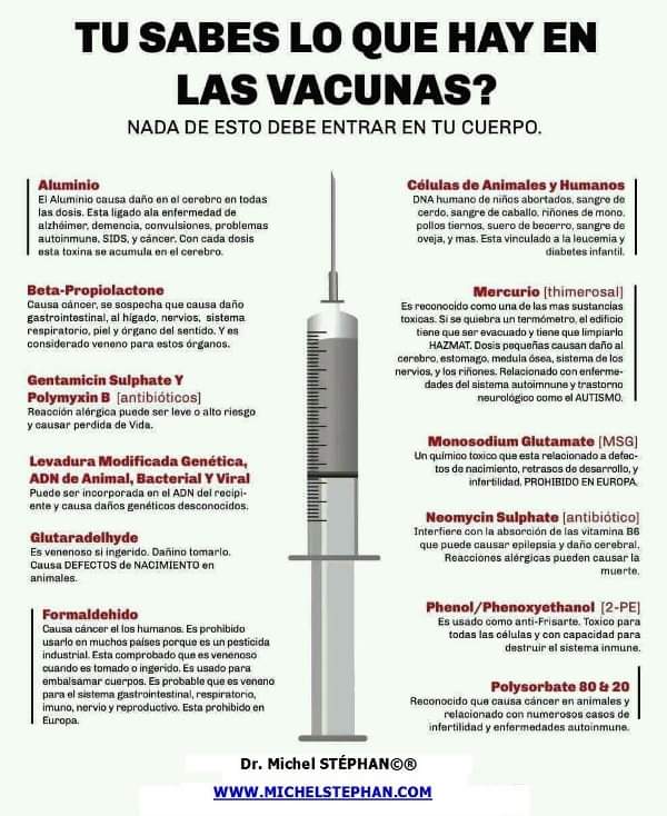 Las vacunas pueden provocar alergias y enfermedades autoinmunes, los componentes más usuales en las vacunas son: tejido fetal abortado de Humanos, DNA, RNA y proteínas de bacterias, hongos, virus, levaduras, tejido fetal de ganado bovino, tejido renal de monos, metales tóxicos, mercurio, aluminio, MSG, formaldehído (conservante de cadáveres) y phenoxyethanol (en la industria se usa como anticongelante), utilizan el mercurio como conservante (timerosal).