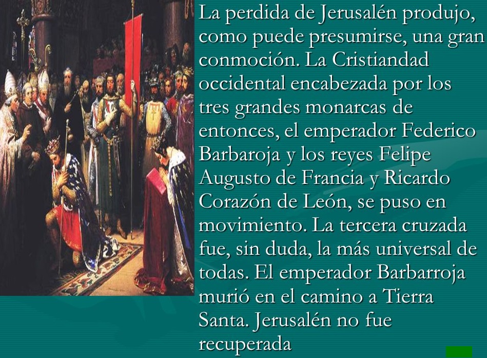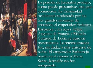 *La Tercera Cruzada, fue convocada por el Papa para ayudar a los cristianos de tierra santa, ya que los musulmanes se unificaron desde Libia hasta Mesopotamia y, al mando de Saladino, conquistaron Jerusalén en 1188 y casi toda Palestina. Sólo la ciudad de Tiro (Líbano) quedó en poder de los Cruzados. Acudieron los Reyes de Inglaterra y Francia, así como el Emperador de Alemania, es decir Ricardo Corazón de León, Felipe II y Federico I (Barbarroja).