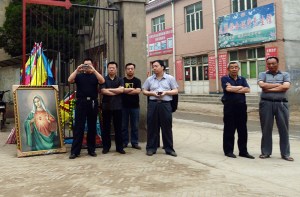 Chinese government and public security officials monitor journalists as they delay the start of a religious parade at the Catholic cathedral in Donglu, Hebei Province on May 26, 2013. Police surrounded a Chinese village to prevent pilgrims from joining a Catholic parade to honour the Virgin Mary, who locals say appeared in the village a century ago. AFP PHOTO / Mark RALSTON