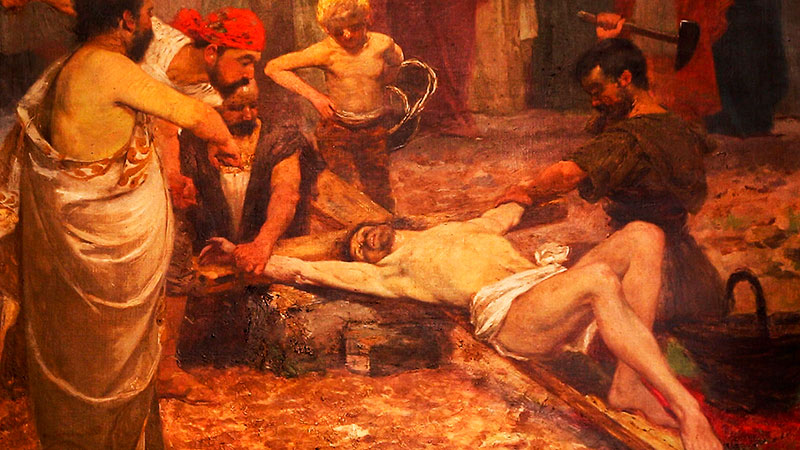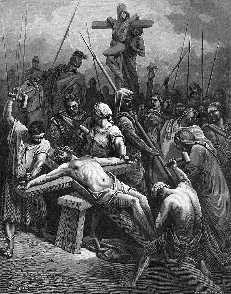 ¿Quién de nosotros tendría valor para sufrir que le atravesasen los pies y manos con gruesos clavos? ¿Quién tendría ánimo para ver así atormentado a su mayor enemigo? Pues este atroz tormento padece Jesús por nuestro amor. Ya le tienden sobre el lecho del dolor; ya enclavan aquella mano omnipotente que había formado los cielos y la tierra; ya brota un raudal de sangre. Más esto es poco. Encogido el cuerpo con el frío y los tormentos, no llegaban la otra mano ni los pies al agujero hecho de antemano en la cruz; los atan, pues, con cordeles, y tiran con inhumana crueldad, desencajando de su lugar aquellos huesos santísimos. ¡Qué dolor! ¡Qué tormento!