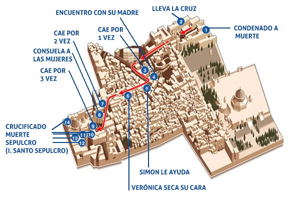 La Vía Dolorosa es una calle de la Ciudad Vieja de Jerusalén. Dicha calle desde la puerta de los Leones asciende hasta el Gólgota y fue el camino que recorrió Cristo, cargando con la Cruz, camino de su crucifixión. Allí se encuentran marcadas nueve de las 15 estaciones del Viacrucis. Las restantes estaciones se encuentran dentro de la Iglesia del Santo Sepulcro.