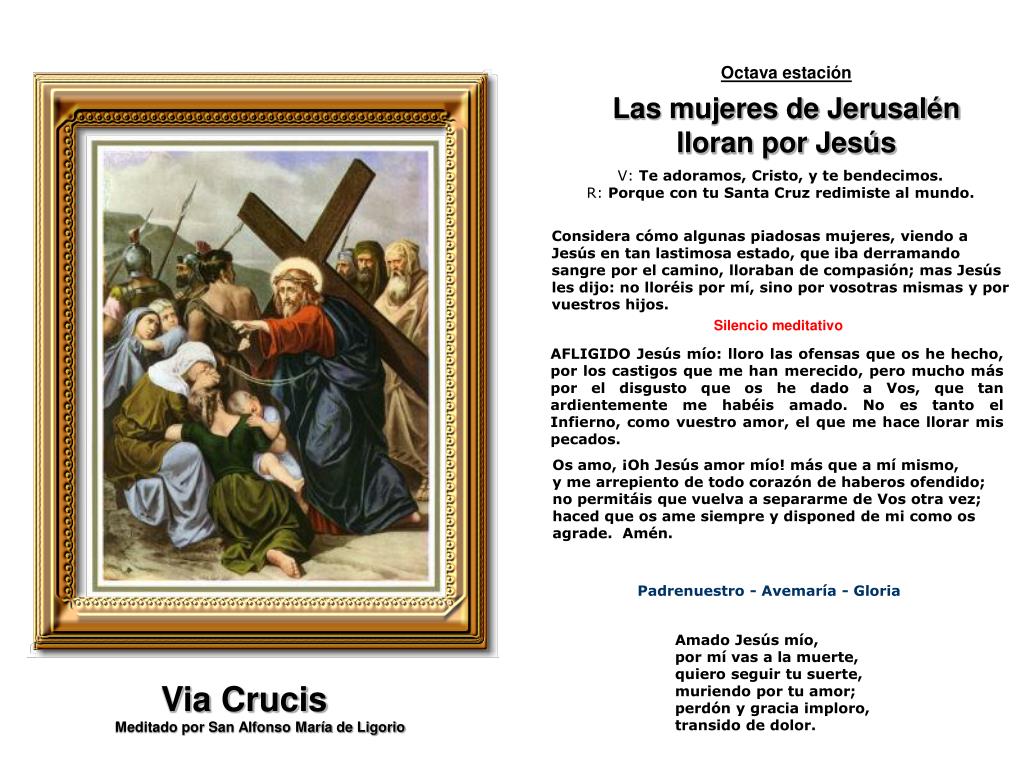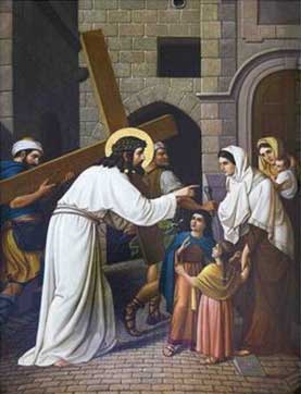 ¡Qué caridad tan ardiente! Olvidando sus atroces dolores, solo se acuerda de nuestras penas el amante Jesús¡. “Hijas de Jerusalén”, dice a las piadosas mujeres que le seguían llorando, “no lloréis mi suerte; llorad más bien sobre vosotras y sobre vuestros hijos”.