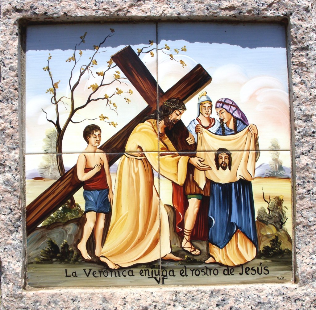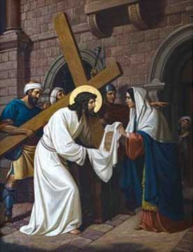 ¡Qué valor el de esta piadosa mujer! Ve aquel rostro divino a quien desean contemplar los ángeles, cubierto de polvo, afeado con saliva, denegrido con sangre; y movida a compasión, se quita la toca, atropella por todo y acercándose al Salvador, le enjuga su rostro desfigurado.
