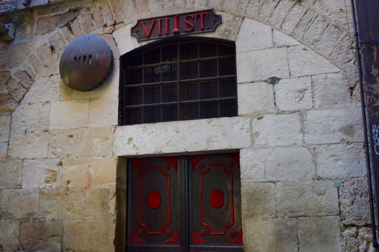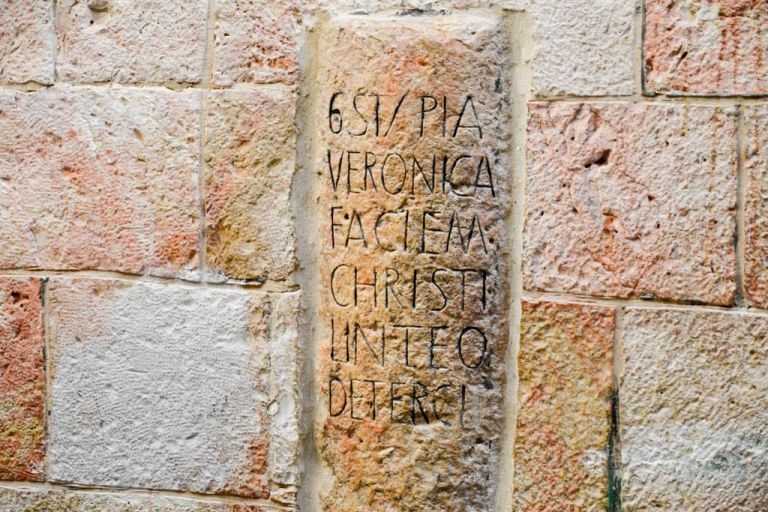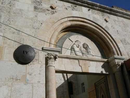 Una inscripción en el arquitrabe de una puerta indica el lugar del encuentro entre Jesús y Simón el Cirineo, que fue quien llevó la pesada cruz de Cristo hasta el monte Gólgota (Calvario), el lugar de la crucifixión.
