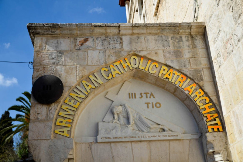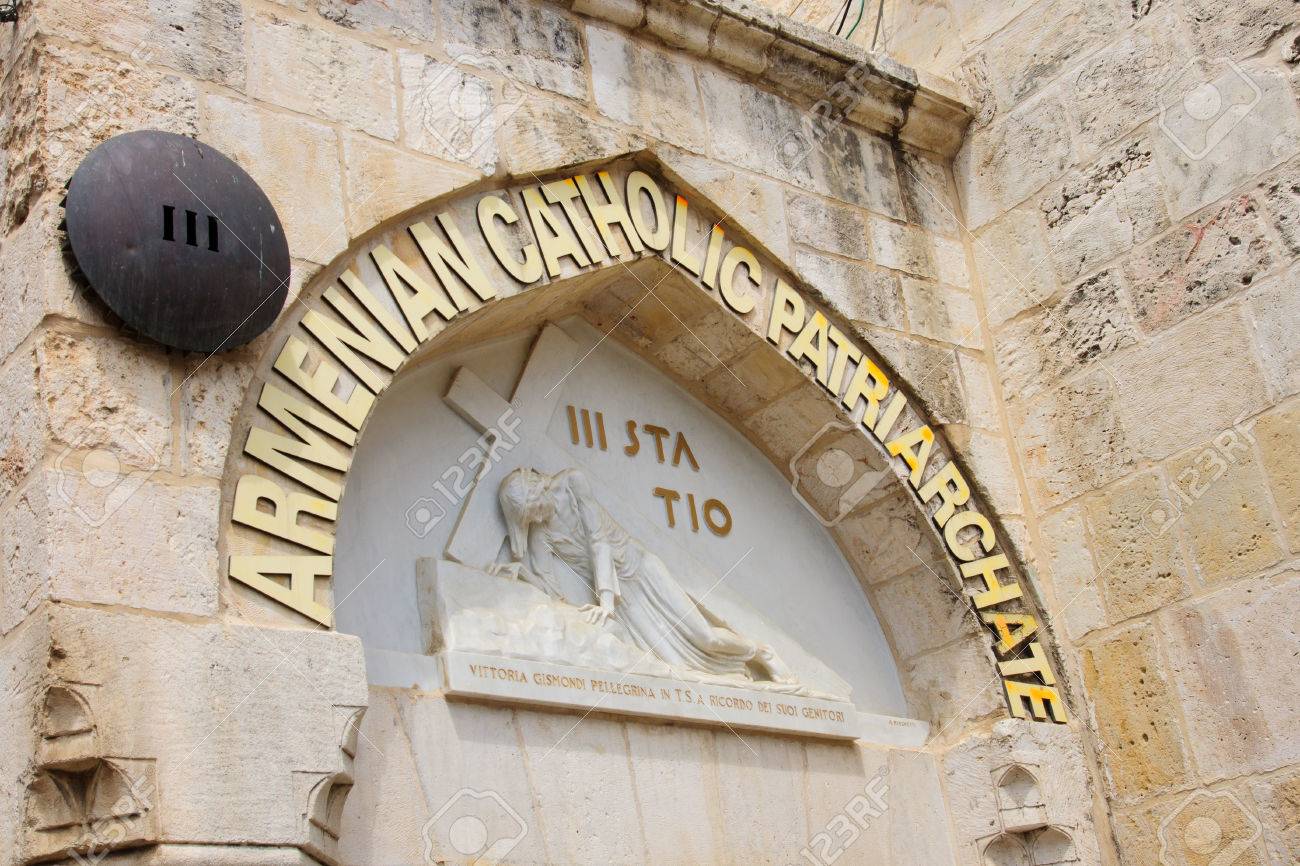 A mark of station 3 of the Via Dolorosa, and an Armenian church, in the old city of Jerusalem, Israel