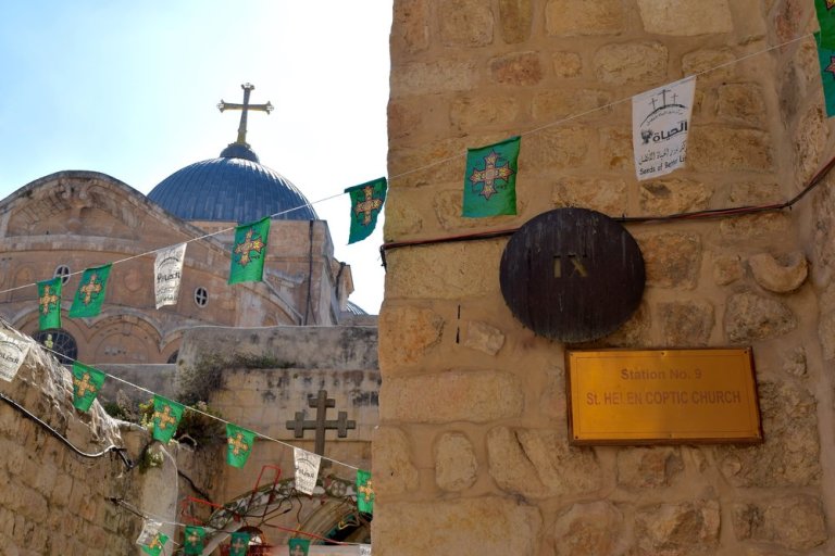 La tercera caída de Jesús es señalada con una columna de la época romana a la entrada del monasterio Copto.