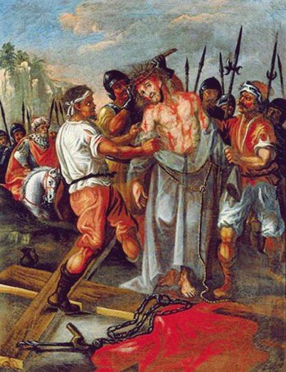 No extraño dulce Jesús mío, que sucumbas rendido al enorme peso de la cruz. Lo que me pasma y hace llorar a los ángeles de paz, es la bárbara fiereza con que te tratan esos sayones inhumanos. Si cae un vil jumento se le tiene compasión, lo ayudan a levantarse. Pero cae el Rey de cielos y tierra, el que sostiene la admirable fábrica del universo, y lejos de moverse a compasión, le insultan con horribles blasfemias, le maltratan y acosan con diabólico furor…