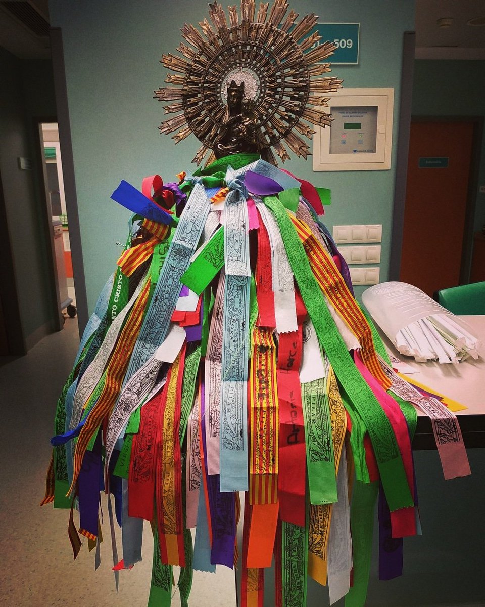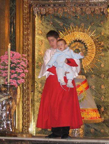 La tradición de “pasar por el manto” de la virgen del pilar, a los niños es antiquísima. Es la imagen más antigua de la virgen, que llego a zaragoza en el año 40, los primeros mantos datan de 1504, ya en 1577 tenía 72 mantos, de allí surgió la frase “Murió bajo el manto de la Virgen del Pilar”, un privilegio que tienen los caballeros y damas de la Corte de Honor de la Virgen y algunas personalidades (el papa Juan XXIII, por ejemplo, o Alfonso XIII, que murió en Roma bajo el manto A principios del siglo XVII. Así las peticiones de mantos de la virgen del pilar de Zaragoza para los enfermos, eran tan abundantes, que se crearon las “medidas de la Virgen“, las famosas cintas, cuya función es cubrir a los enfermos con el manto de la virgen a la hora de la muerte, para alcanzar la misericordia de Dios. Estas cintas miden 36’5 cm, exactamente la altura de la imagen de la Virgen del Pilar.