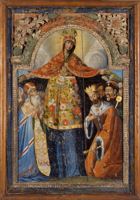 La Virgen Manto de Misericordia acoge bajo su manto a un grupo de figuras suplicantes que imploran a la Reina de los Cielos la salvación eterna, como mediadora en la causa espiritual de la Humanidad.