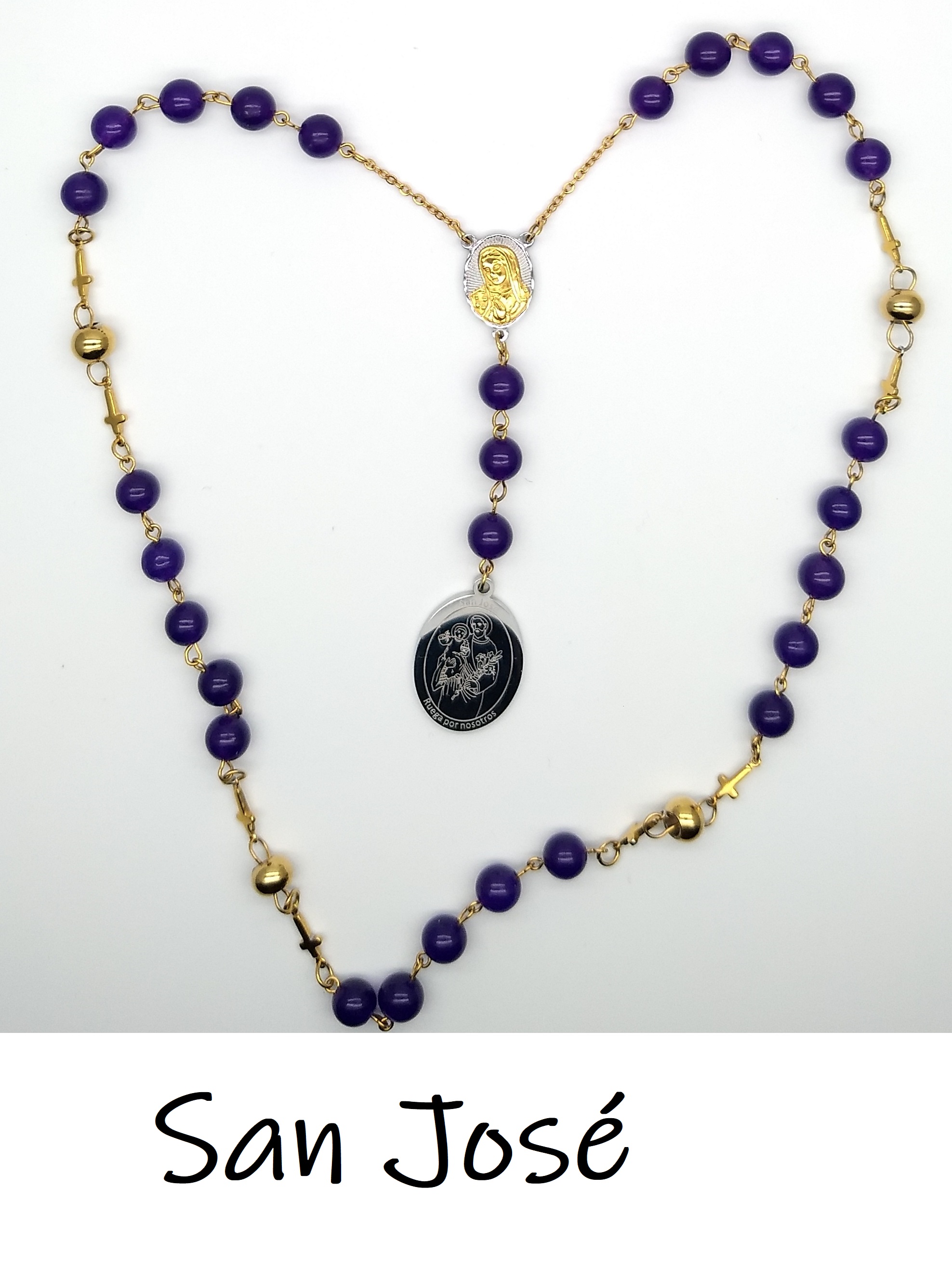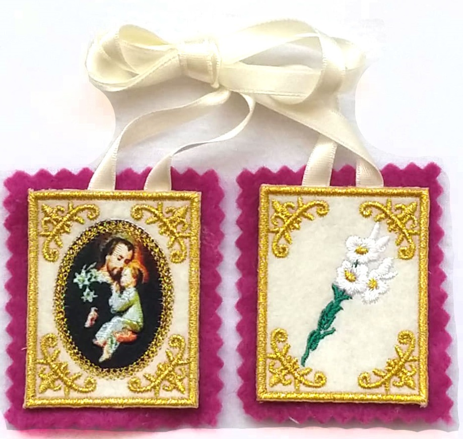 Due to the multiple sources for the scapular, the colors may be in combination, having white, gold and purple. The front of the scapular depicts Saint Joseph carrying the infant Jesus, and a lily in the other hand.