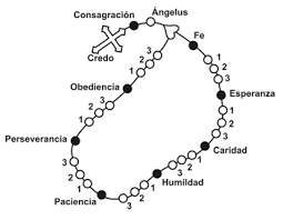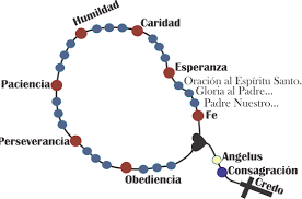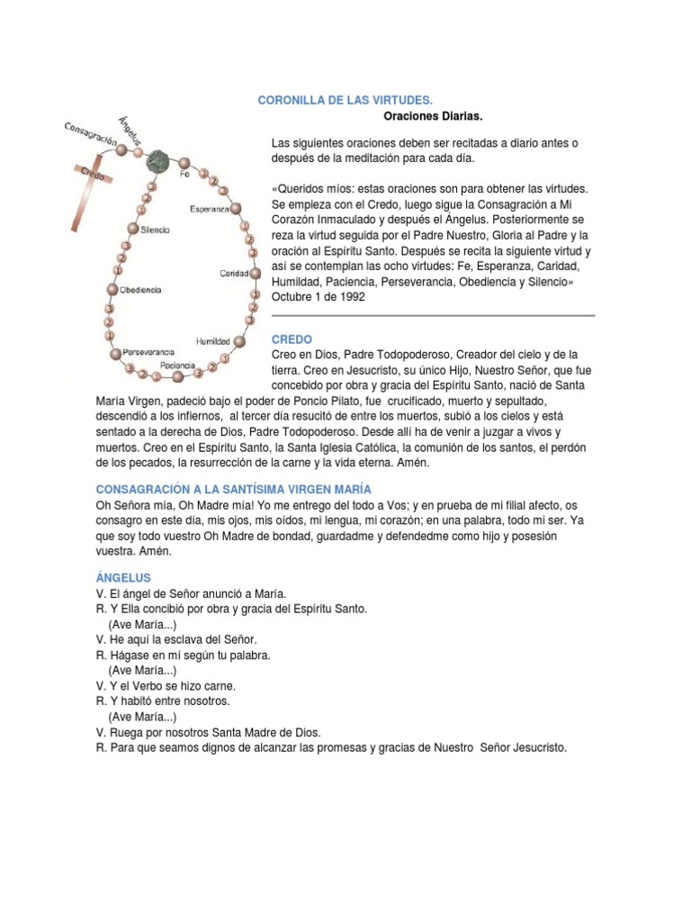 «Queridos míos: estas oraciones son para obtener las virtudes. Se empieza con el Credo, luego sigue la Consagración a Mi Corazón Inmaculado y después el Ángelus. Posteriormente se reza la virtud seguida por el Padre Nuestro, el Gloria al Padre y la oración al Espíritu Santo. Después se recita la siguiente virtud y así se contemplan las siete virtudes: Fe, Esperanza, Caridad, Humildad, Paciencia, Perseverancia y Obediencia.