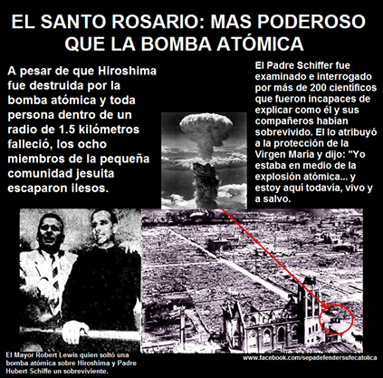 En 1945, durante la Segunda Guerra Mundial, ocho sacerdotes jesuitas vivían en una casa parroquial a menos de una milla de donde se lanzó la bomba atómica en la ciudad de Hiroshima en Japón. Mientras que la iglesia al lado de la casa parroquial fue completamente destruida y miles de personas murieron y miles de personas sufrieron tremendamente por la exposición a la radiación, la casa permaneció en pie y los ocho sacerdotes misioneros sobrevivieron milagrosamente. También fue milagroso e inexplicable que ninguno de los ocho jesuitas sufriera exposición a la radiación.