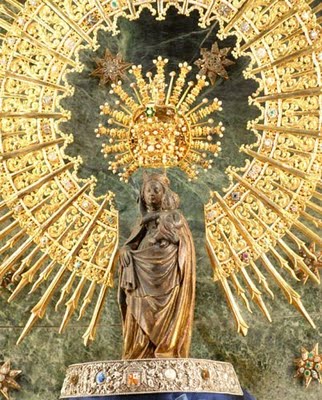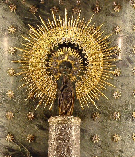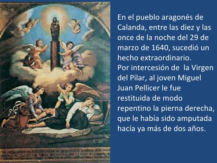 El Apóstol Santiago, hermano de San Juan, viajó a España a predicar el evangelio (año 40 d.C.), y una noche la Virgen María se le apareció en un pilar, estando en profunda oración junto a sus discípulos a orillas del río Ebro, la Santísima Virgen María se manifestó, acompañada por un coro de ángeles, (ella aún vivía en Palestina).La Virgen le habló al Apóstol pidiéndole que se le edificase ahí una iglesia con el altar en derredor al pilar y expresó: “Este sitio permanecerá hasta el fin del mundo para que la virtud de Dios obre portentos y maravillas por mi intercesión con aquellos que imploren mi ayuda”, “Santa María del Pilar”. Es el primer templo del mundo dedicado a la Virgen.