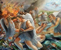 Es también semejante el Reino de los cielos a una red barredera, que se echa en el mar y recoge peces de toda suerte, y, llena, la sacan sobre la playa, y, sentándose, recogen los peces buenos en canastos, y los malos los tiran. Así será a la consumación del siglo: saldrán los ángeles y separarán a los malos de los justos, y los arrojarán al horno de fuego; allí habrá llanto y crujir de dientes.» Mat 13:48-50