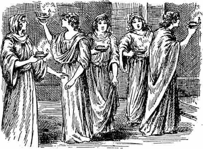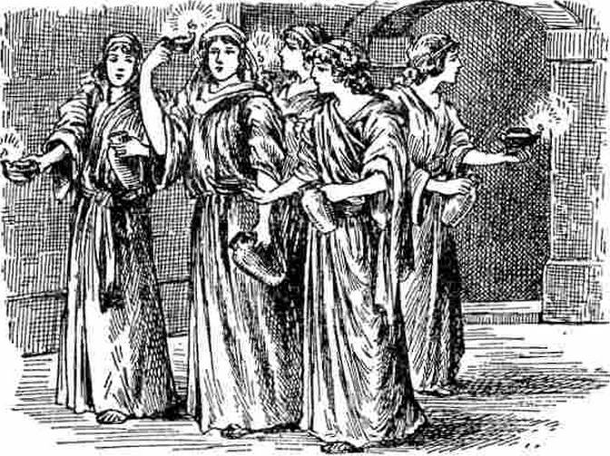 Entonces el reino de los cielos será semejante a diez vírgenes que, tomando sus lámparas, salieron al encuentro del esposo. Cinco de ellas eran necias, y cinco prudentes;” las necias, al tomar las lámparas, no tomaron consigo aceite, mientras que las prudentes tomaron aceite en las alcuzas juntamente con sus lámparas. Como el esposo tardaba, se adormilaron y durmieron. A la medianoche se oyó un clamoreo: Ahí está el esposo; salid a su encuentro.” Se despertaron entonces todas las vírgenes y se pusieron a preparar sus lámparas. Las necias dijeron a las prudentes: Dadnos aceite del vuestro, porque se nos apagan las lámparas. Pero las prudentes respondieron: No, porque podría ser que no bastase para nosotras y vosotras; id más bien a la tienda y compradlo;” pero, mientras fueron a comprarlo, llegó el esposo, y las que estaban prontas entraron con él a las bodas y se cerró la puerta. Llegaron más tarde las otras vírgenes, diciendo: Señor, señor, ábrenos. Pero él respondió: En verdad os digo que no os conozco. Velad, pues que no sabéis el día ni la hora. Mat 25:1-13
