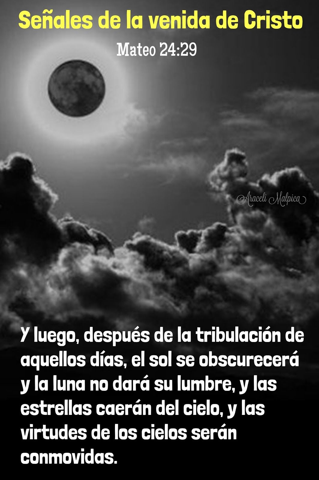Mat_24:29 »Inmediatamente después de la tribulación de aquellos días, «el sol se oscurecerá y la luna no dará su resplandor, y las estrellas caerán» del cielo y «las potestades de los cielos» se conmoverán.