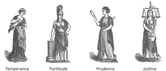 Las virtudes cardinales: Como su nombre indica (de cardo cardinis, el quicio o gozne de la puerta), ya que sobre ellas, como sobre quicios, gira y descansa toda la vida moral humana. Y son cuatro, La prudencia dirige el entendimiento práctico en sus determinaciones; la justicia perfecciona la voluntad para dar a cada uno lo que le corresponde; la fortaleza refuerza el apetito irascible para tolerar lo desagradable y acometer lo que debe hacerse a pesar de las dificultades, y la templanza pone orden en el recto uso de las cosas placenteras y agradables.