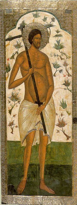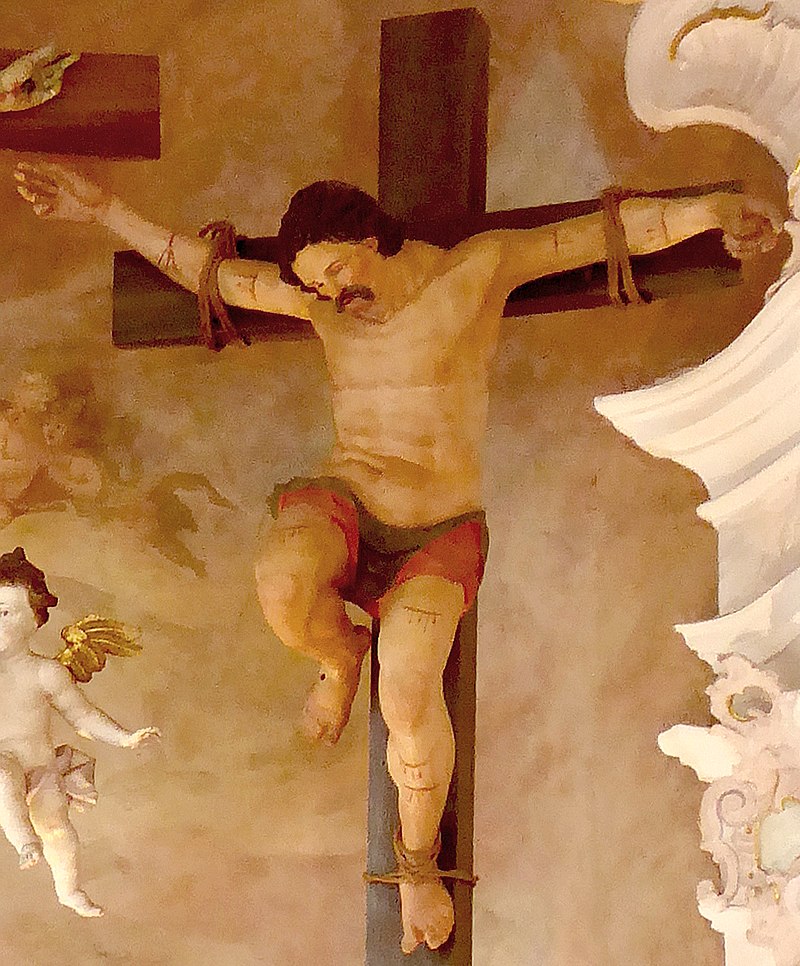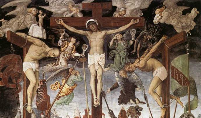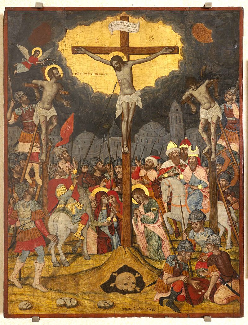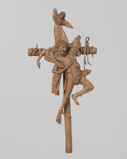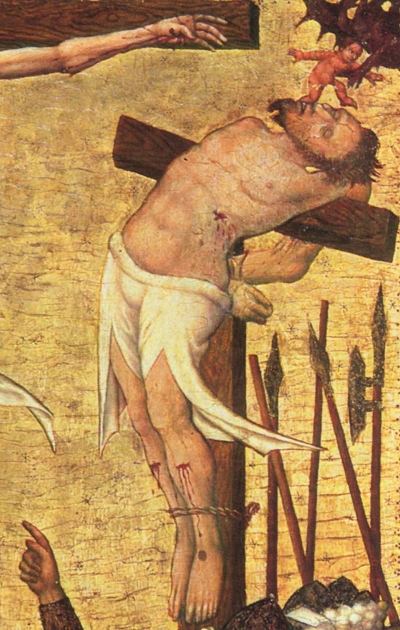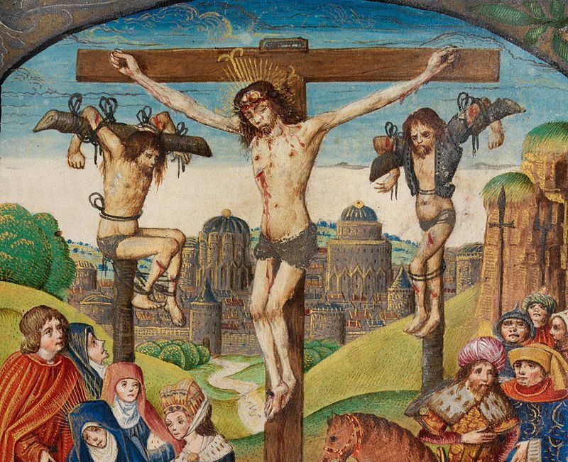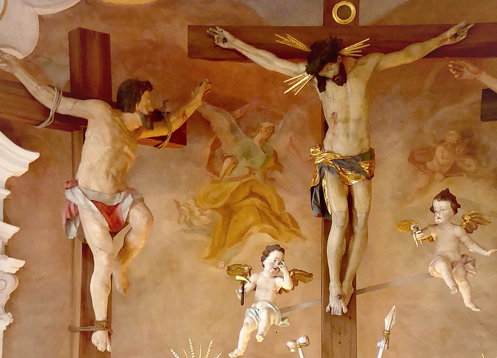 Según el Evangelio de Nicodemo, el Mal Ladrón, llamado Gestas, fue crucificado a la izquierda de Jesús y el Buen Ladrón a su derecha.