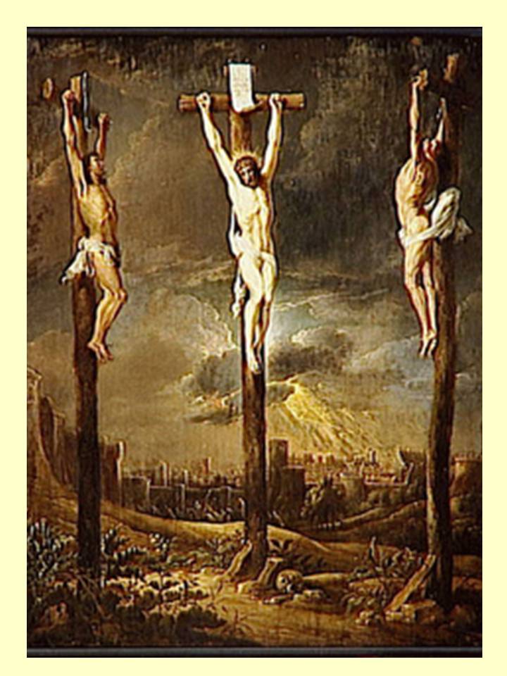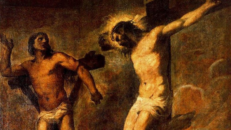 Uno de los malhechores colgados en la cruz le insultaba: «¿No eres tú el Cristo? Pues ¡sálvate a ti y a nosotros!». Pero el otro le respondió diciendo: «¿Es que no temes a Dios, tú que sufres la misma condena? Y nosotros con razón, porque nos lo hemos merecido con nuestros hechos; en cambio, éste nada malo ha hecho». Y decía: «Jesús, acuérdate de mí cuando entres en tu Reino». Jesús le dijo: «Yo te aseguro: hoy estarás conmigo en el Paraíso».