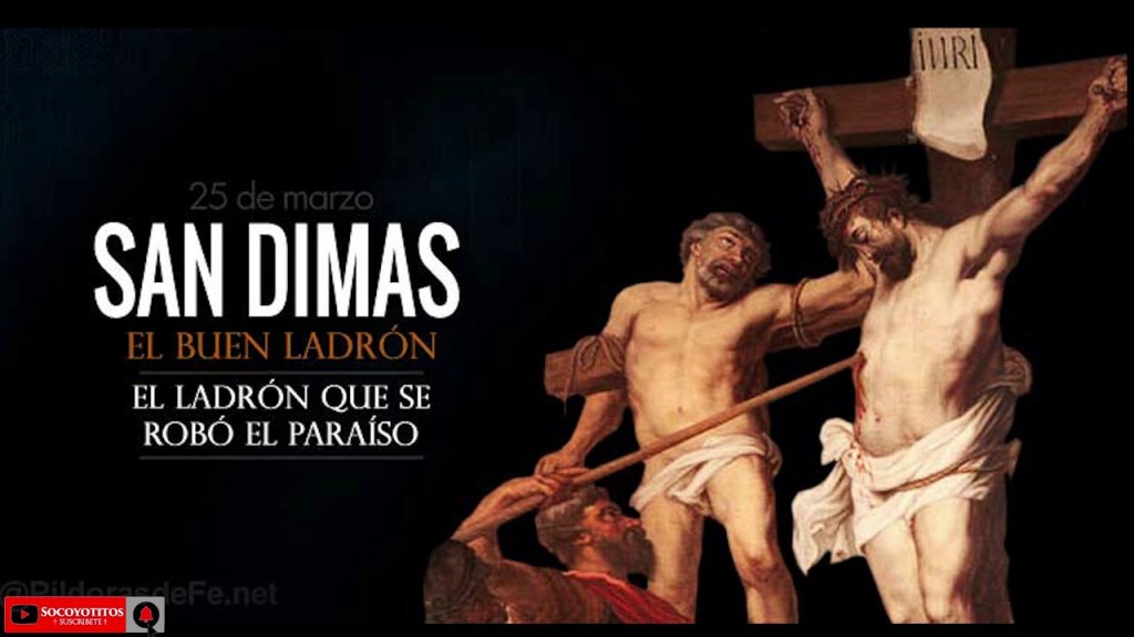 Los dos hacían parte de la compañía de ladrones establecidos en la frontera de Egipto que habían hospedado una noche a la Sagrada Familia en la huida a Egipto con el Niño Jesús. Dimas era aquel niño leproso que su madre, por el consejo de María, lavo en el agua donde se había baño el Niño Jesús, y que se curó al instante.