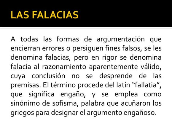 A todas las formas de argumentación que encierran errores o persiguen fines falsos, se les denomina falacias, pero en rigor se denomina falacia al razonamiento aparentemente válido, cuya conclusión no se desprende de las premisas. El término procede del latín fallatia , que significa engaño, y se emplea como sinónimo de sofisma, palabra que acuñaron los griegos para designar el argumento engañoso.