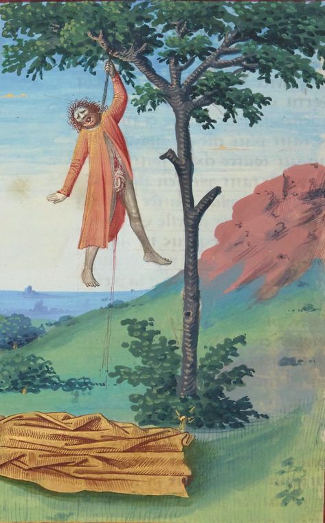 “Judas fue de los nuestros, y había sido llamado a las funciones de nuestro ministerio. Adquirió un campo con el precio de su maldad, y habiéndose ahorcado yéndose de bruces, su cuerpo reventó, crujió por medio y se derramaron todas sus entrañas; quedando esparcidas por tierra; cosa que es notoria a todos los habitantes de Jerusalén, de manera que aquel campo ha sido llamado en su lengua Hacéldama, esto es, Campo de sangre. Hechos 1,18