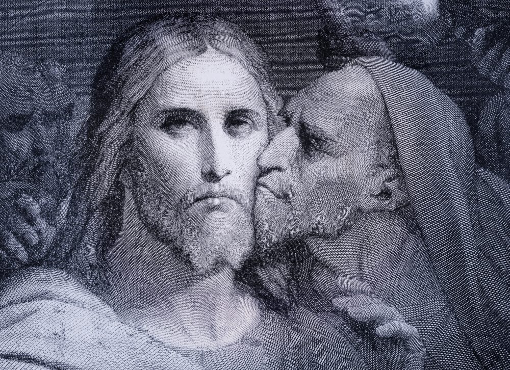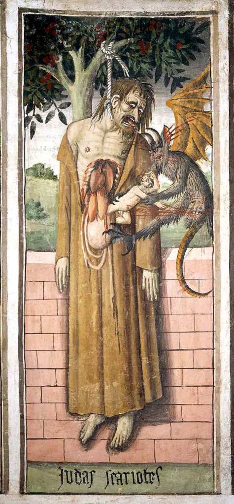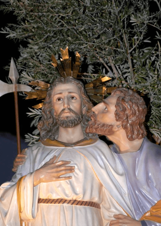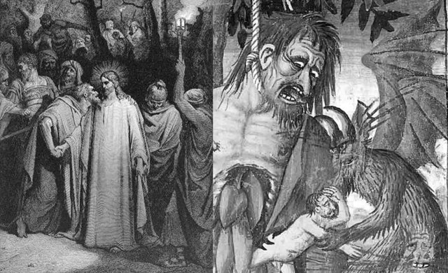 Jesús fue arrestado en Getsemaní, al ver a judas le dijo, «Amigo, ¿a qué vienes? Judas, ¿vas a entregar al Hijo del Hombre con un beso?». Judas desesperado por el demonio quiso devolver las monedas -He pecado entregando sangre inocente -dijo. – ¿A nosotros qué nos importa? Tú veras -dijeron ellos.