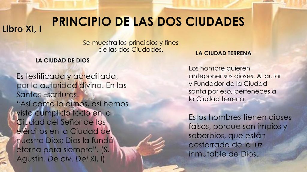 Libro XI, I. Se muestra los principios y fines de las dos Ciudades. LA CIUDAD TERRENA. LA CIUDAD DE DIOS. Los hombre quieren anteponer sus dioses. Al autor y Fundador de la Ciudad santa por eso, perteneces a la Ciudad terrena. Es testificada y acreditada, por la autoridad divina. En las Santas Escrituras. Así como lo oímos, así hemos visto cumplido todo en la Ciudad del Señor de los ejércitos en la Ciudad de nuestro Dios; Dios la fundó eterna para siempre . (S. Agustín. De civ. Dei XI, I) Estos hombres tienen dioses falsos, porque son impíos y soberbios, que están desterrado de la luz inmutable de Dios.