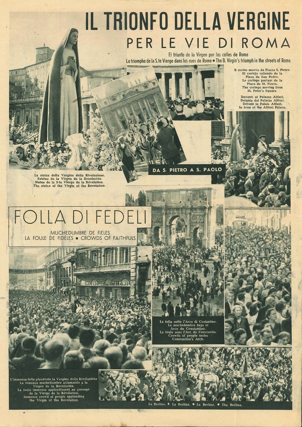 La Virgen de la Revelación en Roma, se apareció en una cueva con una advertencia para un futuro Papa 2 años antes de su elección, en 1937, Luigina Sinapi oyó llorar a una mujer en una cueva en Roma, fue al interior de la cueva y vio a la Virgen llorando; sorprendida miró alrededor y en un rincón, encontró los restos de un feto, luego de enterrarlo, la virgen le dijo “Ve ahora a San Pedro, ahí encontrarás una religiosa que te hará conocer a su hermano, que es un Cardenal. A él, tienes que llevar el mensaje. Desde este lugar llegará a Roma el trono de mi glorificación. Debes decirle al Cardenal que pronto será el nuevo Papa.” Sinapi fue en busca de la mujer, descrita por la Virgen por la apariencia física, y la encontró en San Pedro, era la hermana del Cardenal Eugenio Pacelli. La mística habló con el Cardenal, que la escuchó, con desconfianza… 10 años después, el mismo dia de la aparición, el 5 de octubre de 1947, el Papa Pío XII bendijo una estatua de la Virgen que fue llevada triunfalmente hasta Tre Fontane por más de Cien Mil personas. Que además presenciaron la danza del sol en Roma.