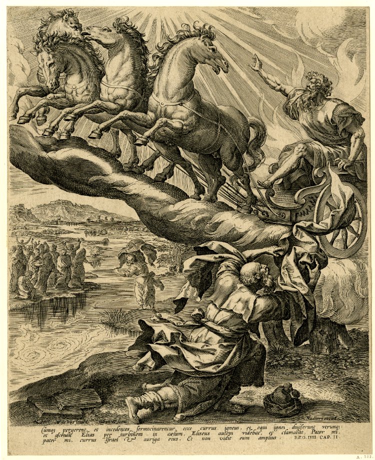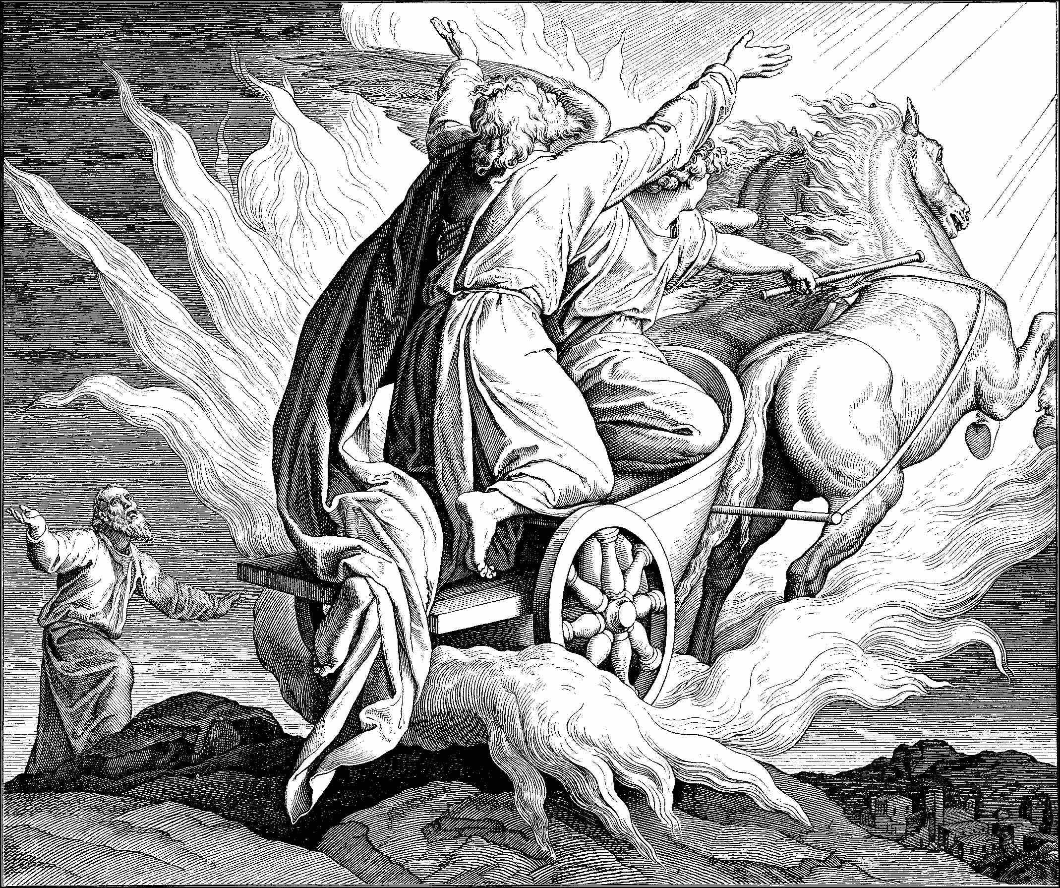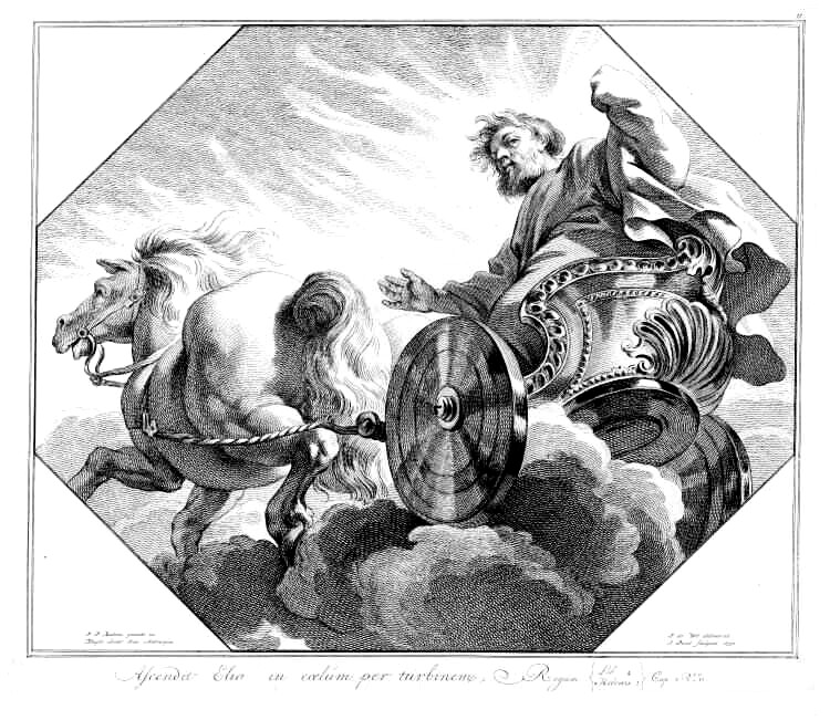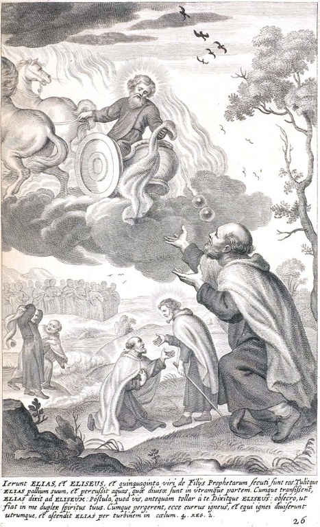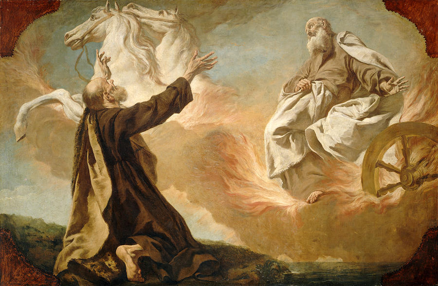 El profeta Elías, el más grande de los profetas después de Moisés, y antes del nacimiento de San Juan Bautista. En el segundo Libro de los reyes, se relata “Esto pasó cuando Yahvéh arrebató a Elías en el torbellino al cielo. Elías y Eliseo partieron de Guilgal. (…) Tomó Elías su manto, lo enrolló y golpeó las aguas, que se dividieron de un lado y de otro, y pasaron ambos a pie enjuto. Cuando hubieron pasado, dijo Elías a Eliseo: Pídeme lo que quieras que haga por ti antes de ser arrebatado de tu lado. Dijo Eliseo: Que tenga dos partes de tu espíritu. Le dijo: Pides una cosa difícil; si alcanzas a verme cuando sea llevado de tu lado, lo tendrás; si no, no lo tendrás.