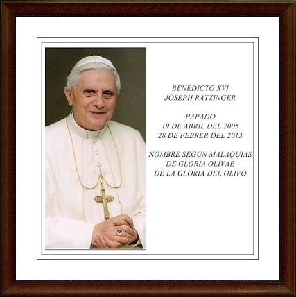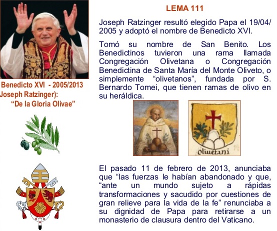 El papa numero 111: “Gloria olivae” (La gloria del olivo). Benedicto XVI papa entre (2005-2013), nació y fue bautizado en un Sábado de Gloria. También se atribuye al escudo de la Orden de los benedictinos que contiene un olivo.