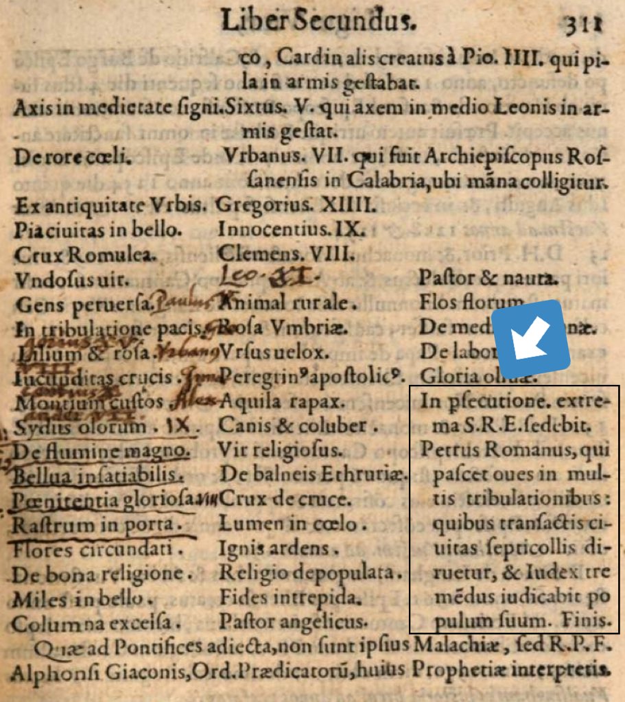 La Profecía de san Malaquías publicada en 1595 por el arzobispo de Armagh, es una serie de 111 pequeños lemas o frases en latín, sin numerar, haciendo alusión alegórica a los siguientes 111 papas que gobernarían la Iglesia católica, desde Celestino II (1143-1144) hasta un último pontífice con el lema Petrus Romanus.