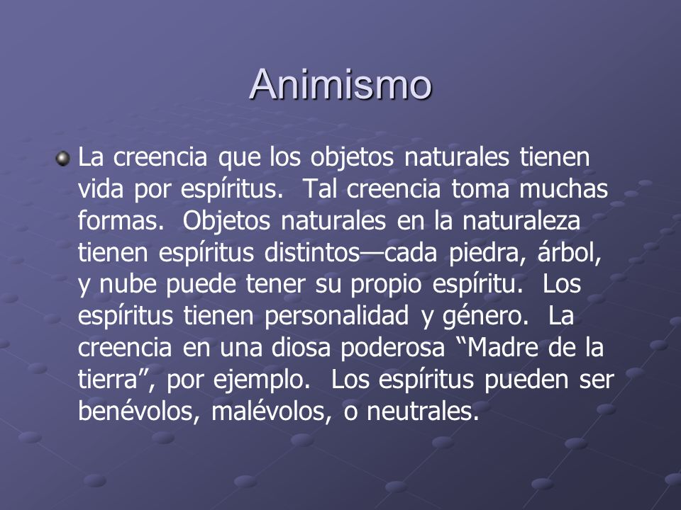 La creencia que los objetos naturales tienen vida por espíritus. Tal creencia toma muchas formas. Objetos naturales en la naturaleza tienen espíritus distintos—cada piedra, árbol, y nube puede tener su propio espíritu. Los espíritus tienen personalidad y género. La creencia en una diosa poderosa Madre de la tierra , por ejemplo. Los espíritus pueden ser benévolos, malévolos, o neutrales.