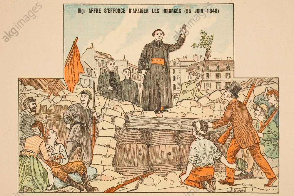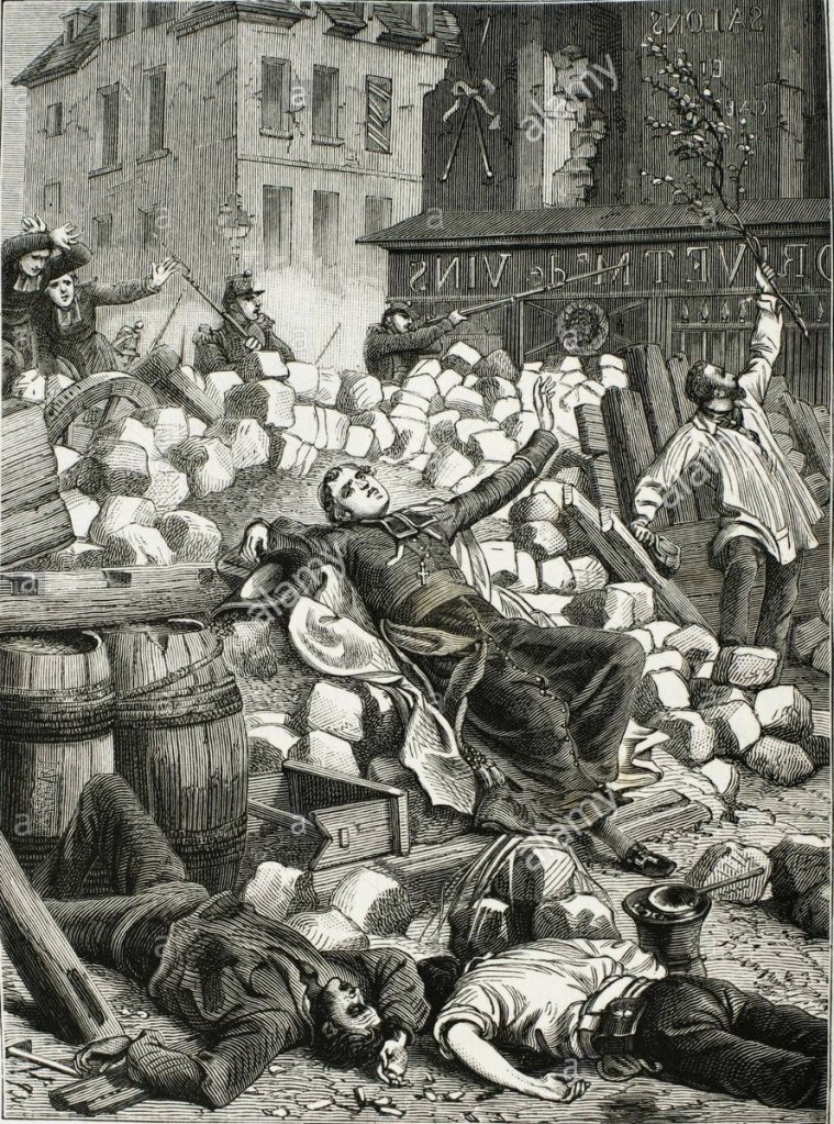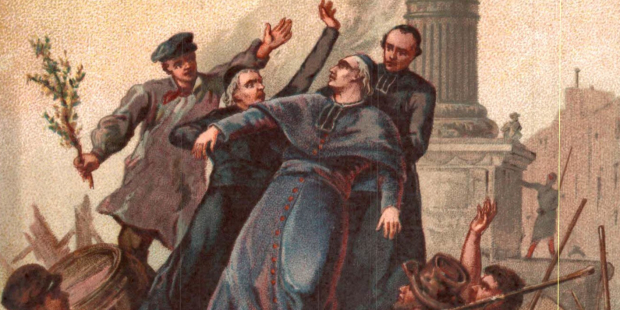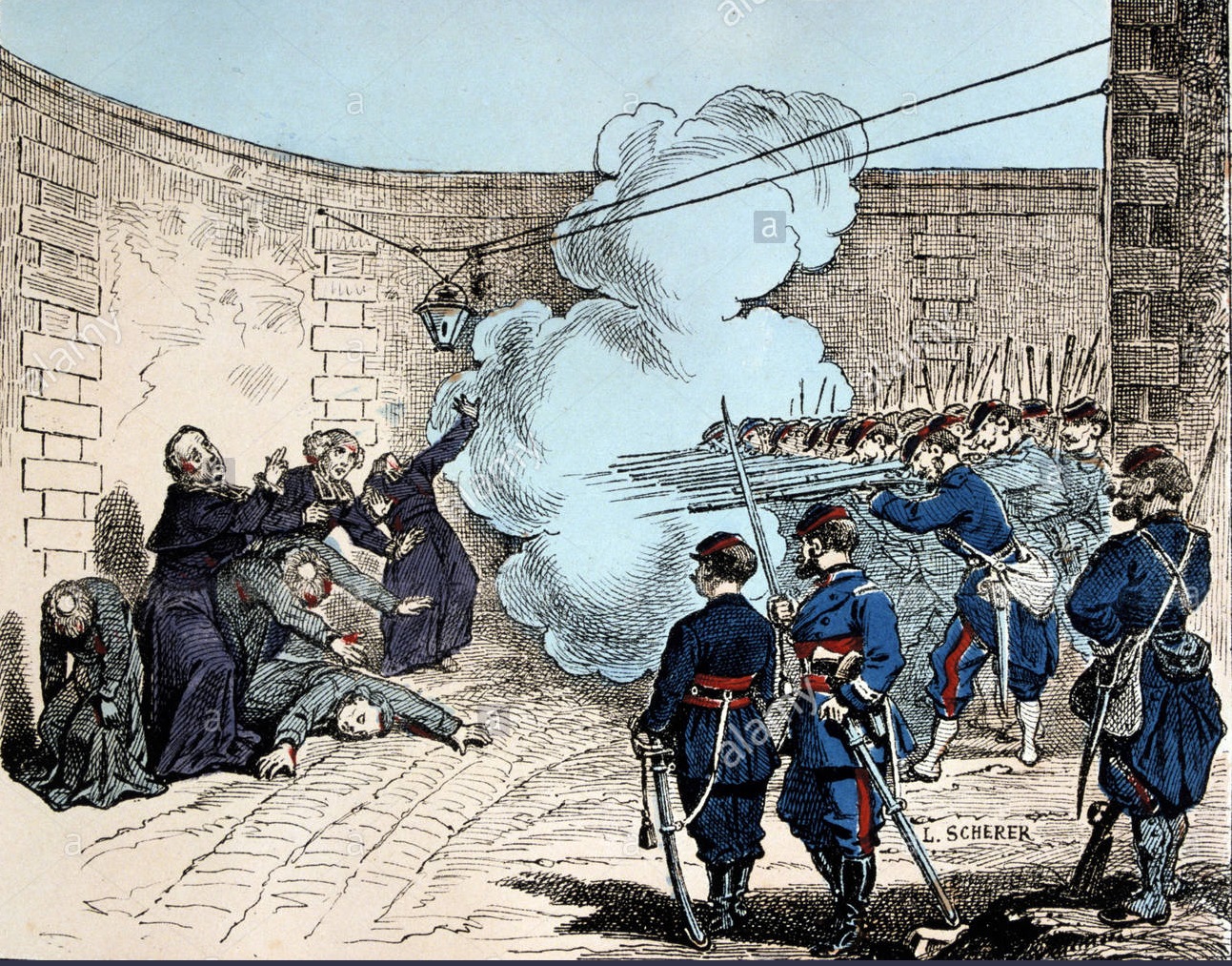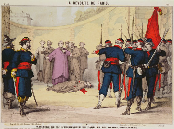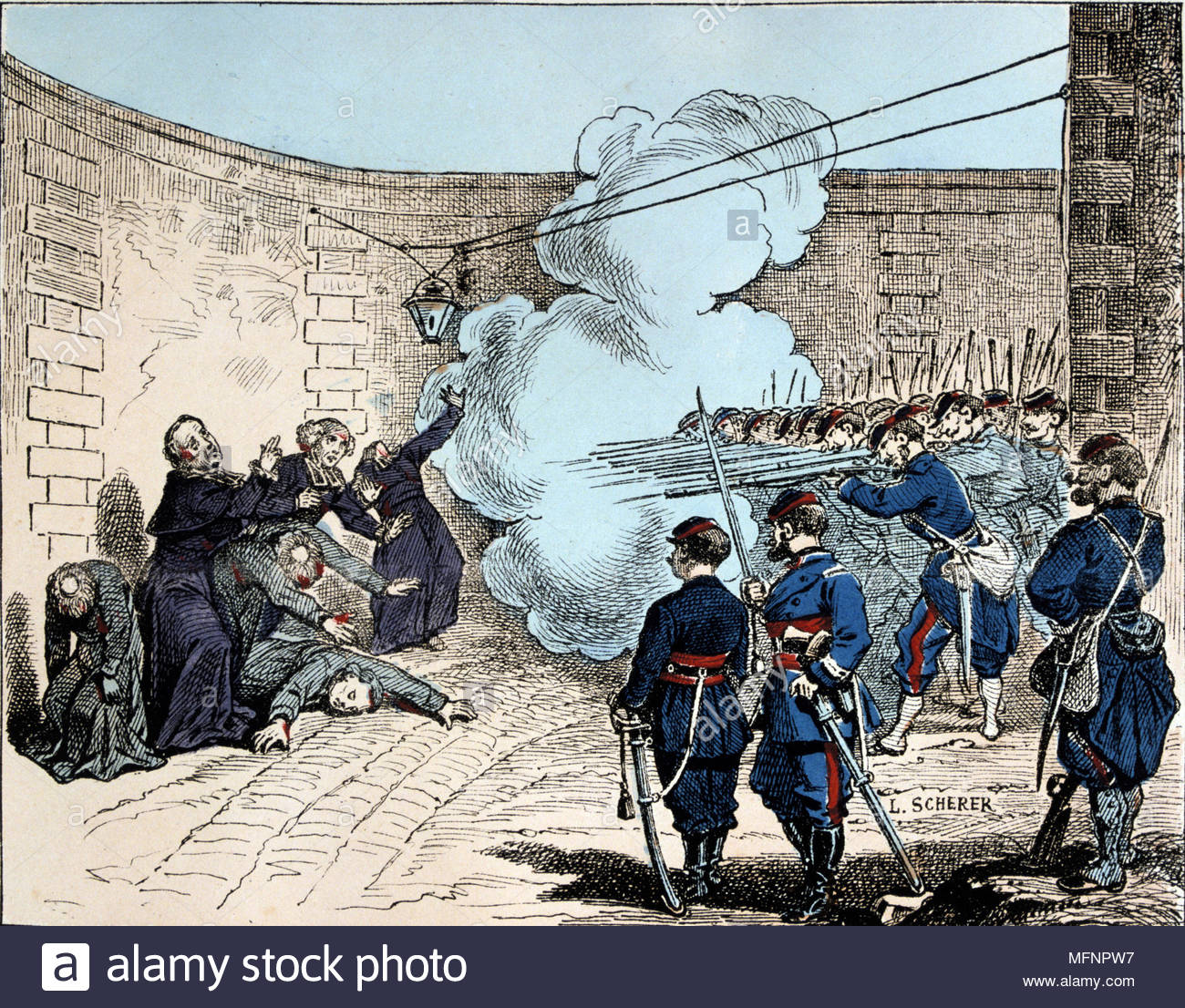 XIR407839 Execution of the Archbishop of Paris, Monseigneur Darboy, during the Paris Commune, 1871 (colour engraving) by French School, (19th century); Bibliotheque Nationale, Paris, France; (add.info.: Georges Darboy (1813-1871) archbishop of Paris, was among a group of prominent hostages executed at the Paris Commune of 1871;); Giraudon; French, out of copyright