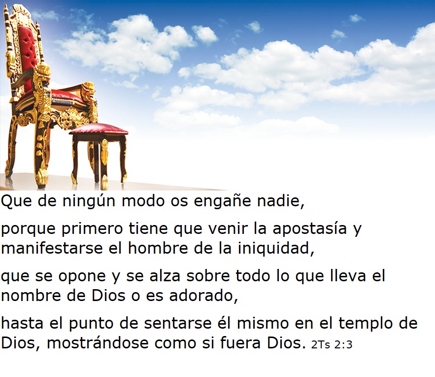 Que de ningún modo os engañe nadie, porque primero tiene que venir la apostasía y manifestarse el hombre de la iniquidad, el hijo de la perdición, que se opone y se alza sobre todo lo que lleva el nombre de Dios o es adorado, hasta el punto de sentarse él mismo en el templo de Dios, mostrándose como si fuera Dios. 2Ts 2:3