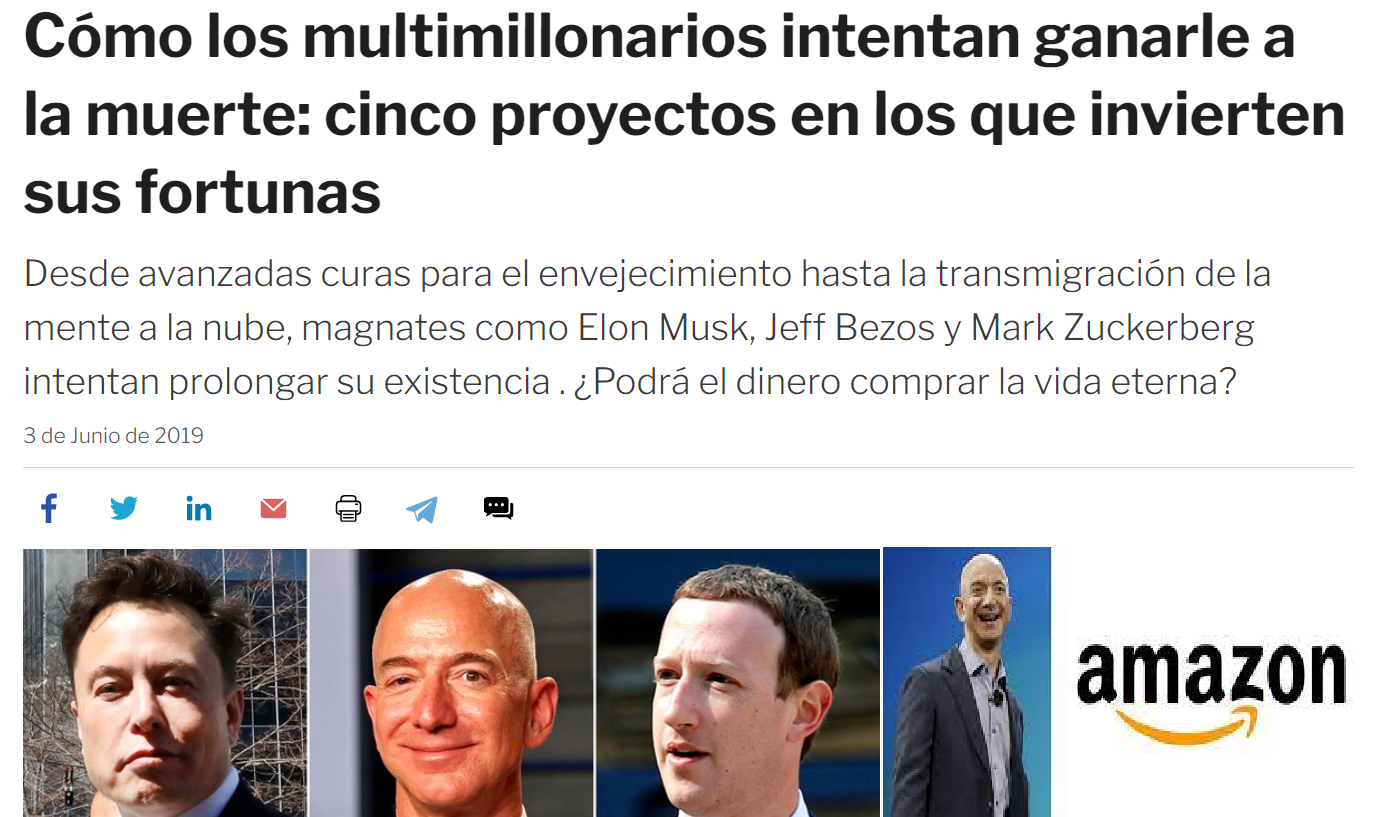 La expectativa de vida en 1900 era de 32 años, hoy es de 85 y extenderla a 120 años es una realidad, pero llevarla a los 500 años tomara aun un par de décadas, según la apuesta que han hecho Facebook que invirtió 3000 millones de dólares, misma cifra que invirtió Google y microsoft. En la universidad de la singularidad, fundada por la nasa y otras grandes instituciones, que busca la amortalidad, dicen, estamos a un paso de la inmortalidad, pero que deben lidiar con la escatología y las creencias religiosas para saltarse la bioetica, ya que el proceso requiere de células fetales y tecnología que la iglesia considera impía.