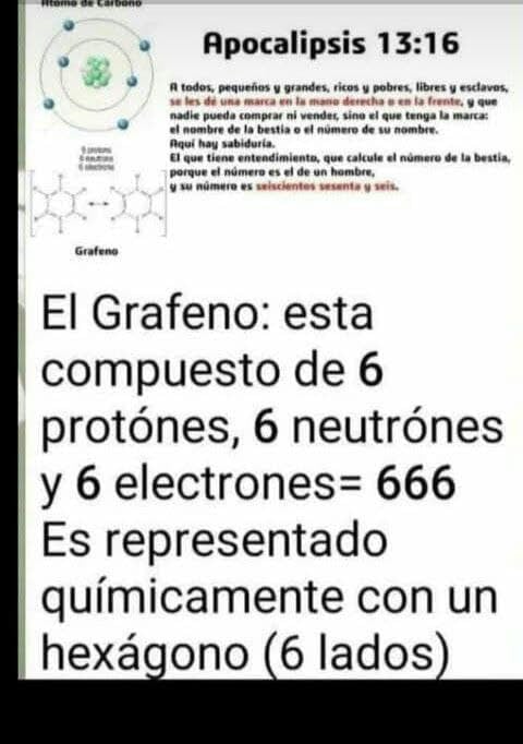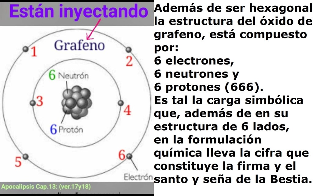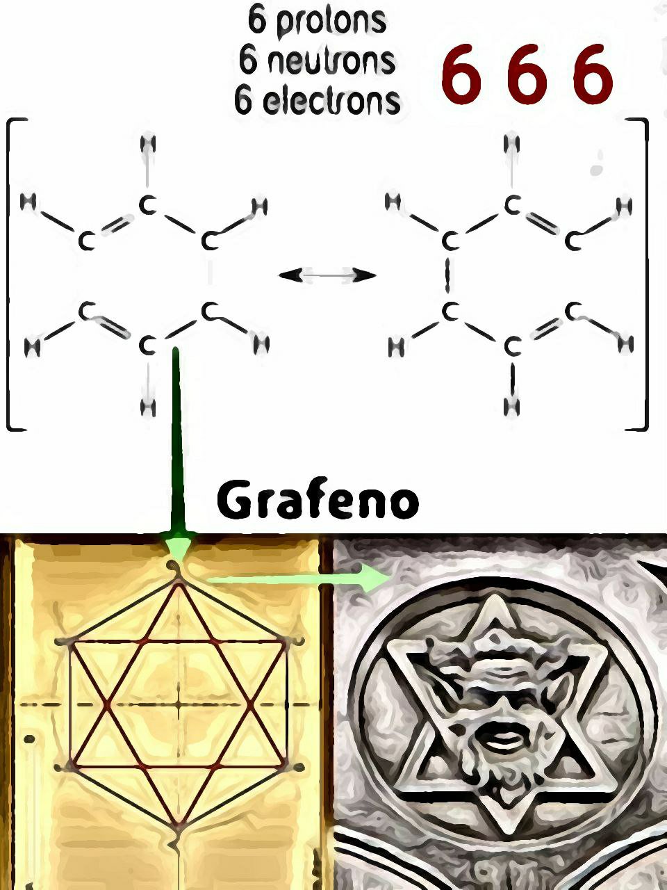 El Grafeno, es un alótropo del carbono que consiste en una sola capa de átomos, un semimetal líquido, con propiedades electrónicas inusuales, llamado «el Santo Grial de la Ciencia», es doscientas veces más resistente que el acero y su dureza supera a la de los diamantes, conduce el calor y la electricidad de manera muy eficiente, y absorbe la luz de todas las longitudes de onda visibles. Consiste en 6 electrones 6 neutrones y 6 protones, un inquietante 666.