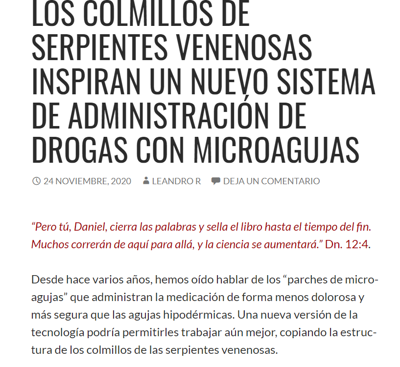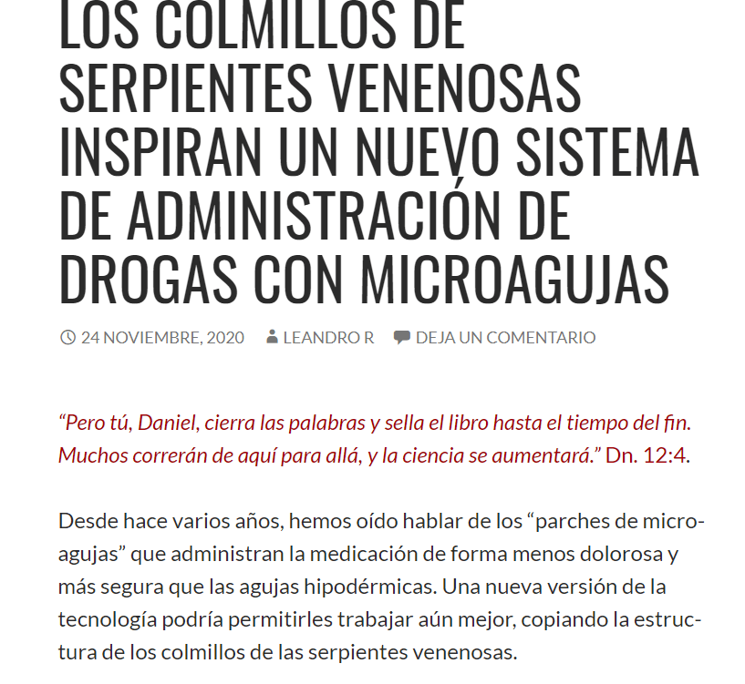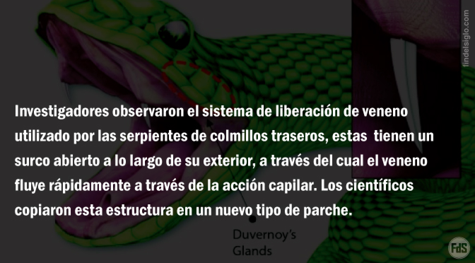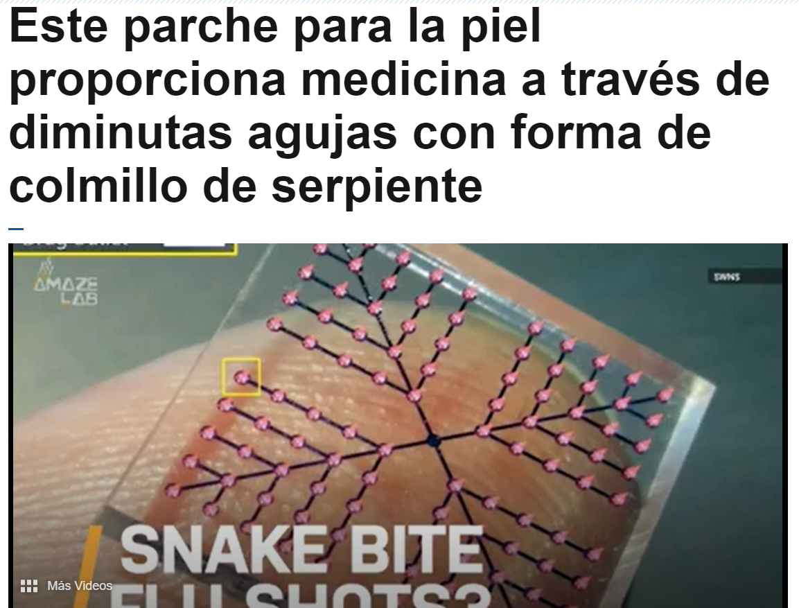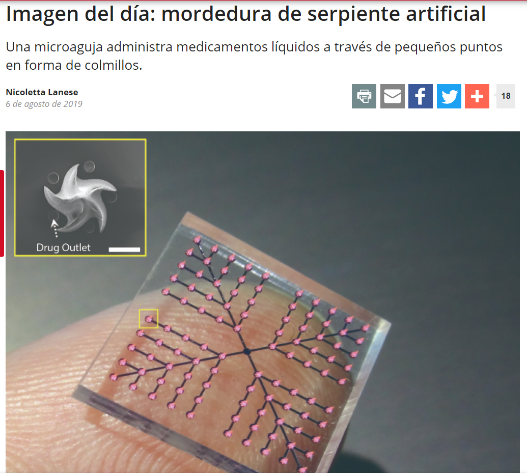 31/07/2019 Un parche similar a un colmillo de serpiente administra rápidamente medicamentos líquidos. Científicos de Corea del Sur han creado un parche de microagujas basado en el colmillo de las serpientes, capaz de administrar líquidos terapéuticos y vacunas a través de la piel de los roedores en menos de 15 segundos, según publican en ‘Science Translational Medicine’. El dispositivo evita los sistemas de bombeo y los pasos adicionales de preparación del medicamento asociados a los parches de microagujas existentes hasta la fecha, lo que lo convertiría en una plataforma de administración flexible y fácil de usar. SALUD W.-G. BAE ET AL., SCIENCE TRANSLATIONAL MEDICINE (