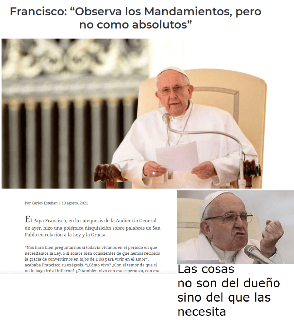 Cuando dicen que los mandamientos no son absolutos, debemos entender que los pecados de la cintura para abajo ya no son causales del infierno o que enfrentamos la abolición del pecado o la negación de la obra de Dios en el hombre, gracias al pensamiento ilustrado que elimina a Dios y lo reemplaza por la Diosa razón o Pachamama.
