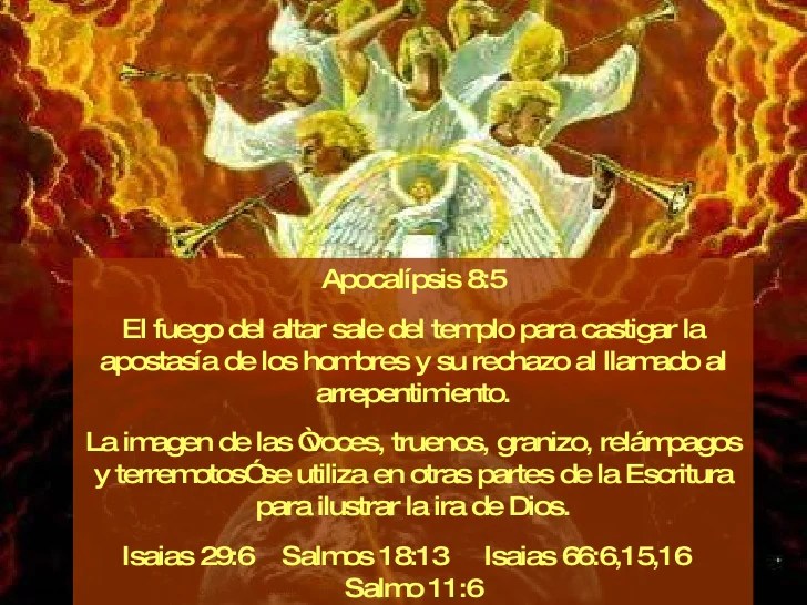 Sobreviene tu ira, y el tiempo de ser juzgados los muertos, y de dar el galardón a tus siervos los profetas, y a los santos, y a los que temen tu Nombre, pequeños y grandes, y de acabar con los que han corrompido la tierra. y hubo relámpagos, y voces, y rayos, y un temblor y granizo fuerte. Apo 11:17 Lo que viene a ser una combinación de los castigos del antiguo testamento aumentados.